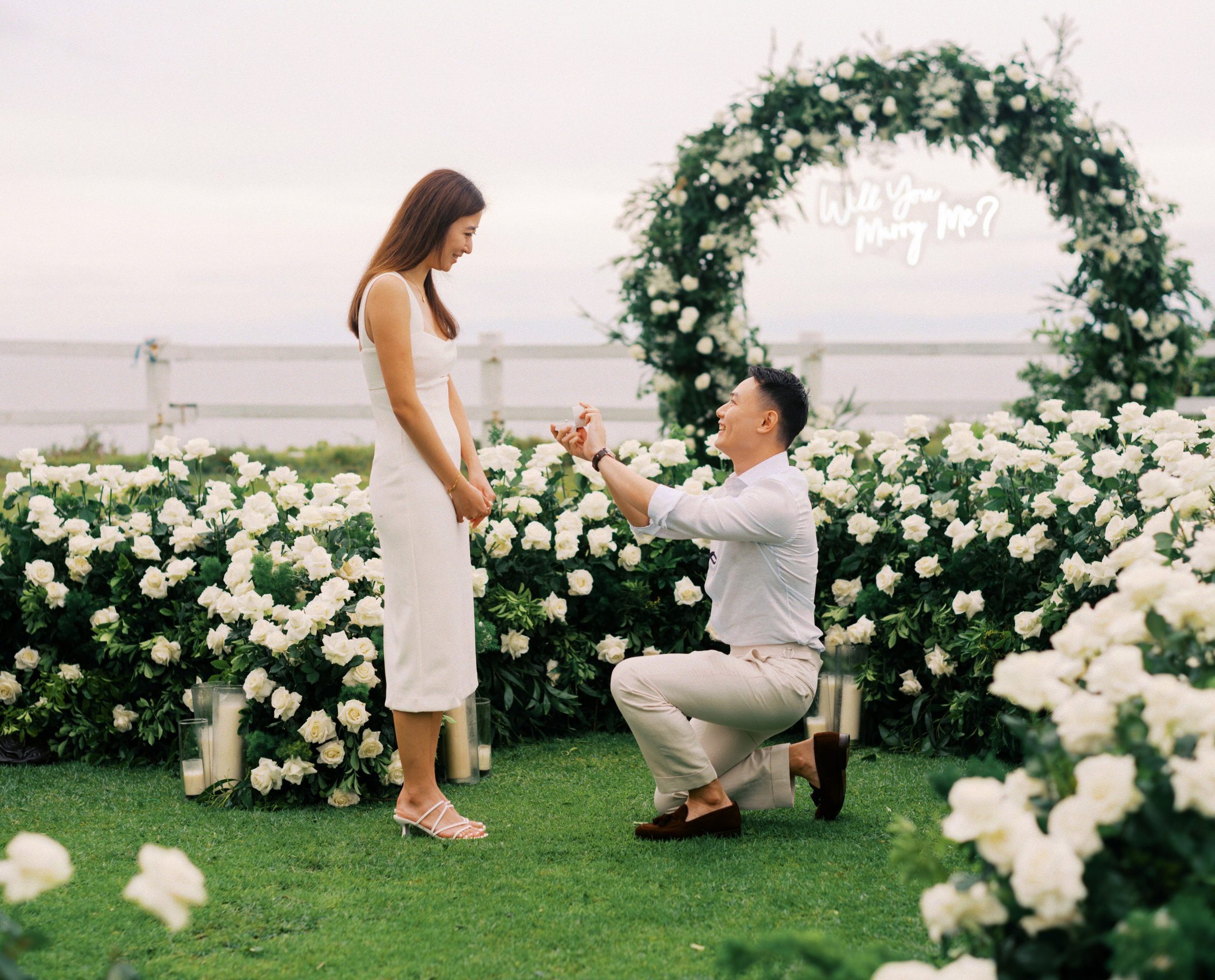 A rainy-day proposal in Bali with 1,500 roses in a giant heart at New Kuta Golf. Despite the weather, our team set up everything under